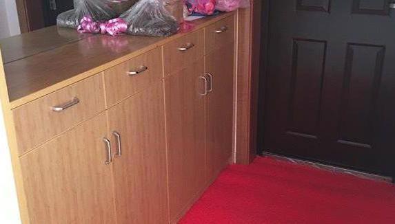 玄关很宽敞,放了一排鞋柜和换鞋凳,上面还有镜子,出门前可以整理一下仪表