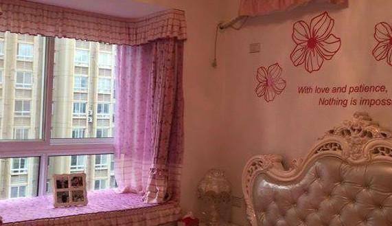 主卧也是婚房在设计上面很注重颜色的搭配,窗户上安装的是磨砂玻璃,床头背景墙粉嫩粉嫩的,